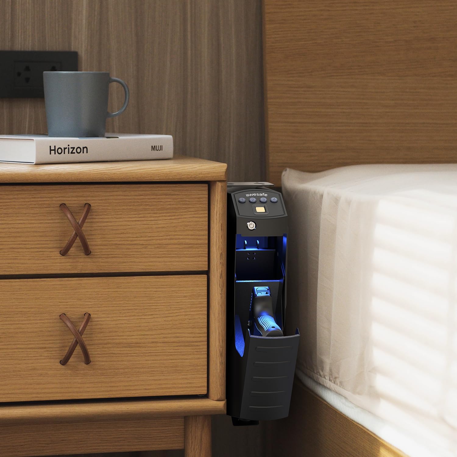 【GUN SAFE IS YOUR HOME SAFE】If you have young children who don’t understand the potential danger of firearms, it’s essential that keep them safely stored. Placing them in this pistol safe is a responsible way to properly secure your small firearms. This is the most important reason why we designed this gun safe for pistol. 【A UNIQUE DESIGN HANDGUN SAFE】Slim vertical and mounted safe with hidden design stores great under a desk or nightstand, desk, wall, on your dresser, or wherever you would like. A pistol safe with LED interiors will help you locate your firearm in a dimly lit room. 【3 WAY QUICK ACCESS FIREARM SAFE】This gun safe box with an upgraded smart biometric fingerprint scanner with immediate access mode, backlit keypad lock, and manual keys. Which makes you grab your firearm in various ways. 【TOUGH & RUGGED & PRY-RESISTANT】Expertly crafted using sturdy steel construction, the awsafe quick access handgun safe will provide long-lasting strength. It also features a prevents corrosion, making it easy to incorporate into any interior space. It is an ideal choice for home or business to add extra security.
