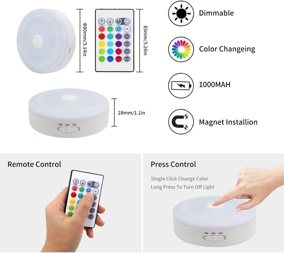 Color Changing Lights:16 Colors Option, 4 dynamic setting with Fade, Strobe,Smooth, Flash function,10 brightness adjustable.Perfect for your cabinet,closet or display case and anywhere you want decoration. Two Control Methods:Remote & Manual Control,In the range of 8 meters, you can easily control the wireless lights by the 24 key IR remote control.When you can't find the remote control for a while, you can also control the puck light by pressing the button.Single Click Change the Color and Long press to turn on/off light. Two Installation Methods:Built-in Magnetic and tape,you can easy intall it anywhere by simply peel the sticker off the tape.The magnet design makes it can be directly attached to any ironwork,and easy to disassemble to charge.Perfect as an under cabinet led lighting. Rechargeable- No need AAA batteries,Built in 1000mAH rechargeable battery,at least 200 times of repeated charging,with long life time about 200 months.USB Rechargeable Puck Light only takes 1-2 hours to fully charge.