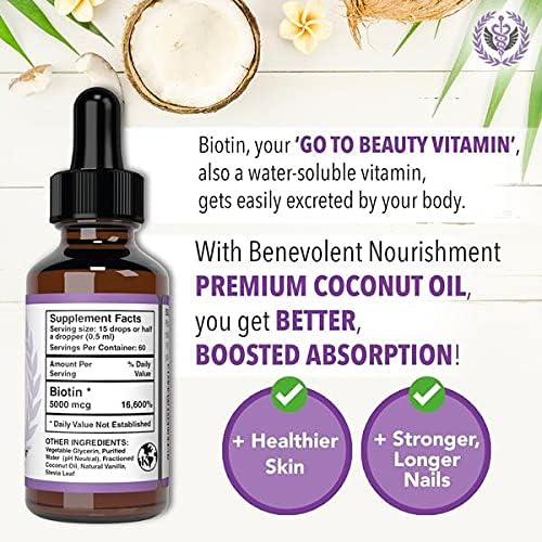 Benevolent Liquid Biotin 5000 mcg - Infused with Coconut Oil for 5X Absorption, Non-GMO & Vegan Friendly Biotin for Hair Growth Glowing Skin and Strong Nails, Hair Growth Products, Biotin Supplement