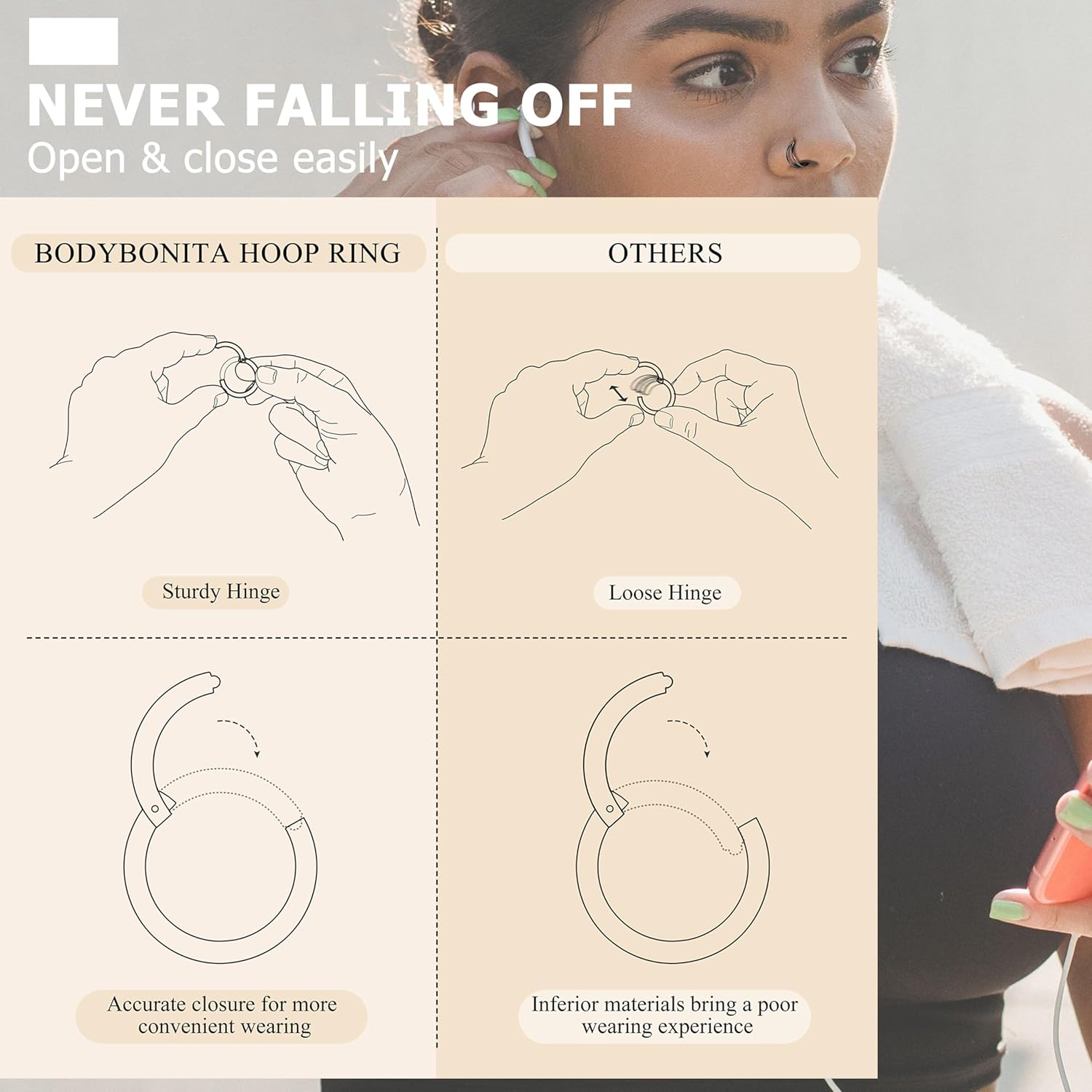 Seamless Black Plated Nose Ring Hoop: Gauge size: 18G(1.0mm); Inner diameter: 8mm(0.31 inches); Material: 316L stainless steel. One order includes 3 pieces of hinged segment ring, come in various styles to meet your fashion needs: sparkly CZ nose hoop, double hoop nose ring, dainty single septum hoop. We've provided the size comparison chart for your reference. Premium Quality: It stays in place, never falls off. You can engage in any intense activity without worry. These 18G nose rings are designed with utmost care for your wearing experience. We meticulously control every manufacturing process to ensure the effortless convenience on open and close the click closure. Hypoallergenic: Perfectly suited for people with sensitve skin, our septum hoops undergo rigorous testing to guarantee they are nickel and lead-free, prioritizing your skin's safety. Long-lasting Shine: Our black plated nose rings are expertly electroplated to prevent tarnishing, ensuring they maintain their shine over time.