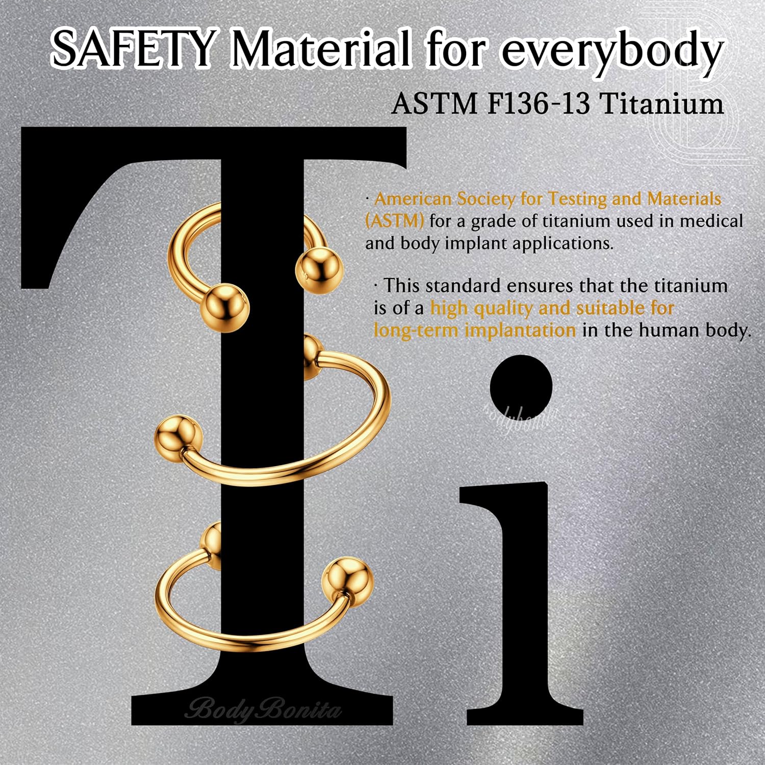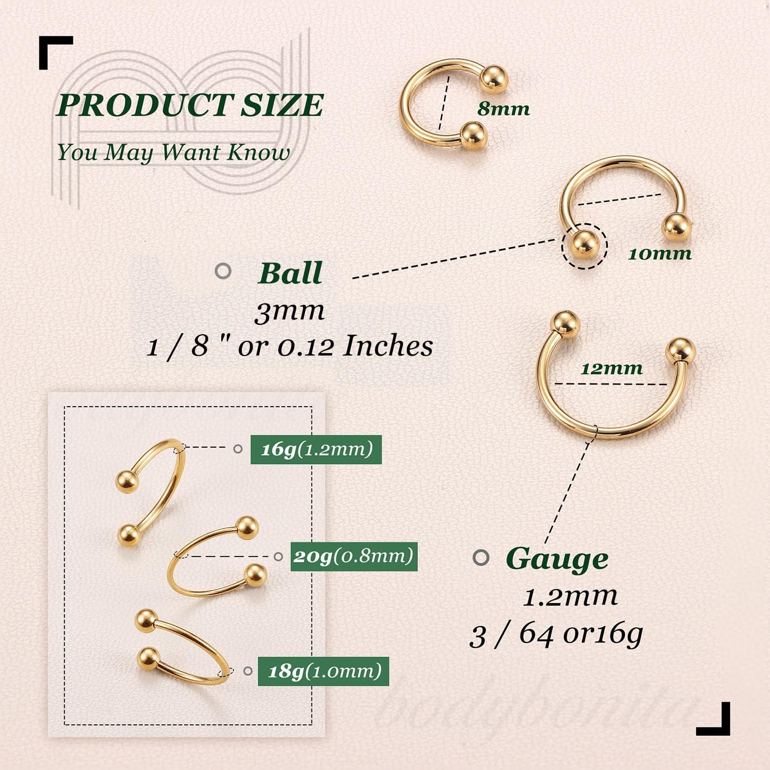 Horseshoe Septum Rings: Gauge size: 16G (1.2mm);Color: Gold; One order includes 3 pieces of septum rings with 3 different inner diameters: 8mm (0.31 inches), 10mm (0.39 inches), and 12mm (0.47 inches).Ball Size(diameter): 3mm; Material: G23 Titanium (ASTM F136 standard). Please refer to our size chart to select the appropriate size. Reach out to us any time if you have questions regarding the received item ASTM-F136 Certified Titanium: Biocompatible and safe for long-term contact with body piercings. Perfectly suited for people with sensitive skin. We ensure that our implant grade titanium used for septum jewelry is of premium quality, free from nickel and lead elements. Convenient Choice for Daily Use: It stays in place and never falls off. These titanium 16G septum rings has lighter weight than surgical steel nose rings. The internally threaded design ensure a secure fit that won't come loose with everyday wear, also easier for close & open. You can trust with reliability of our pieces to stay intact and in place, providing both elegance and peace of mind. Versatile Usage: Our horseshoe nose rings can be used as septum piercings (Anillos de tabique), nostril rings (Aros en la nariz), lip piercings (aretes para labios), tongue piercings, nipple, hoop belly button rings, cartilage earrings (Pendientes de cartílago), daith piercing jewelry, conch hoop earrings, helix earrings, tragus earrings, and rook earrings (Anillo nasal de titanio).