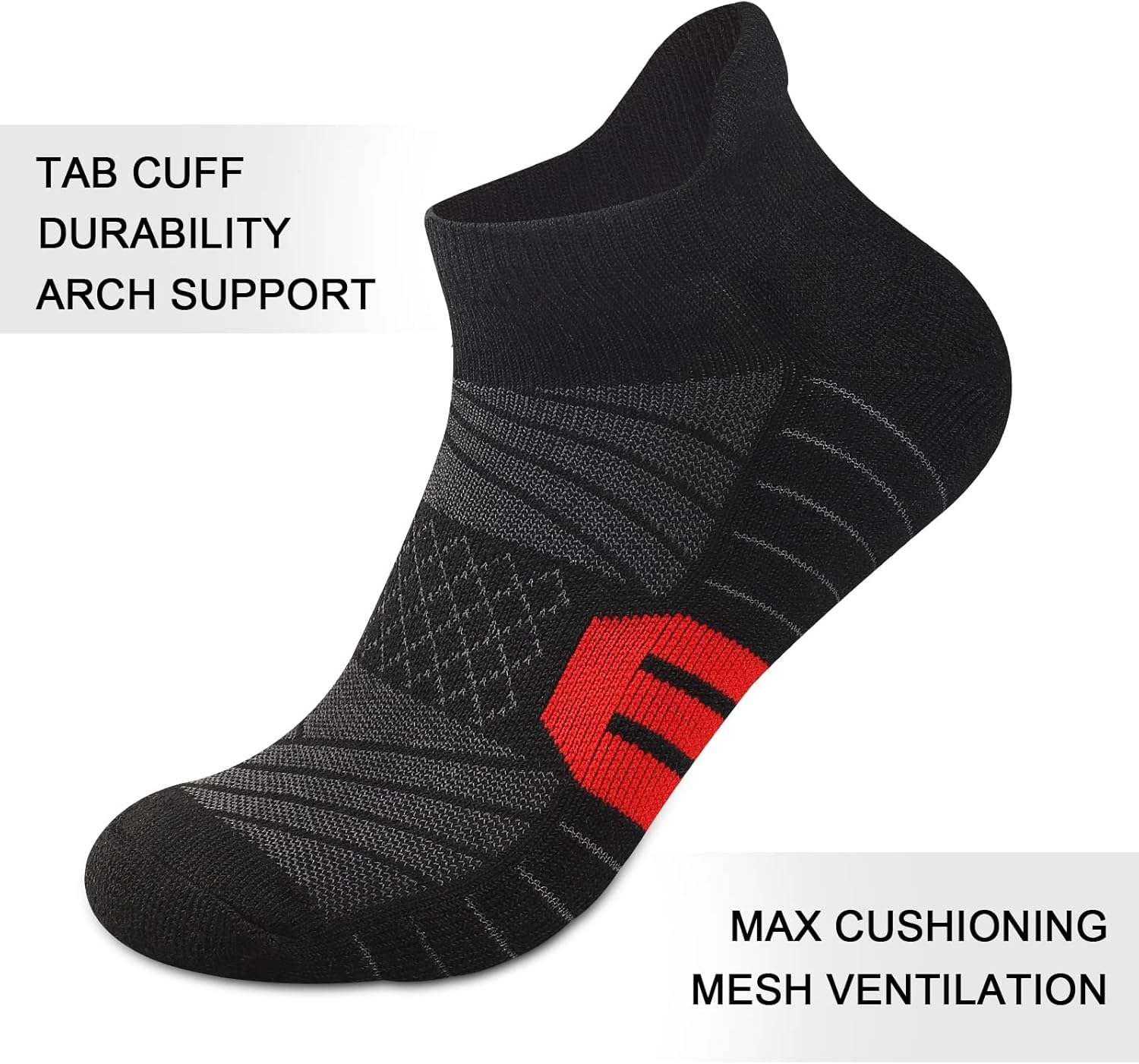 COOPLUS Mens Ankle Athletic Cushion Socks Breathable Low Cut Sports Running Socks with Tab (6 Pairs) One Size Black(red)-6 Pairs