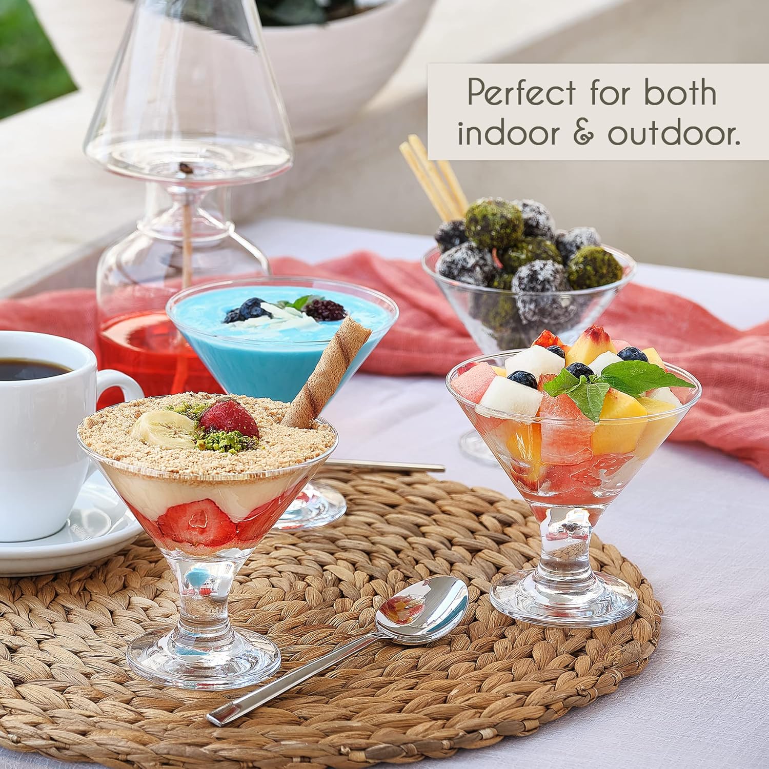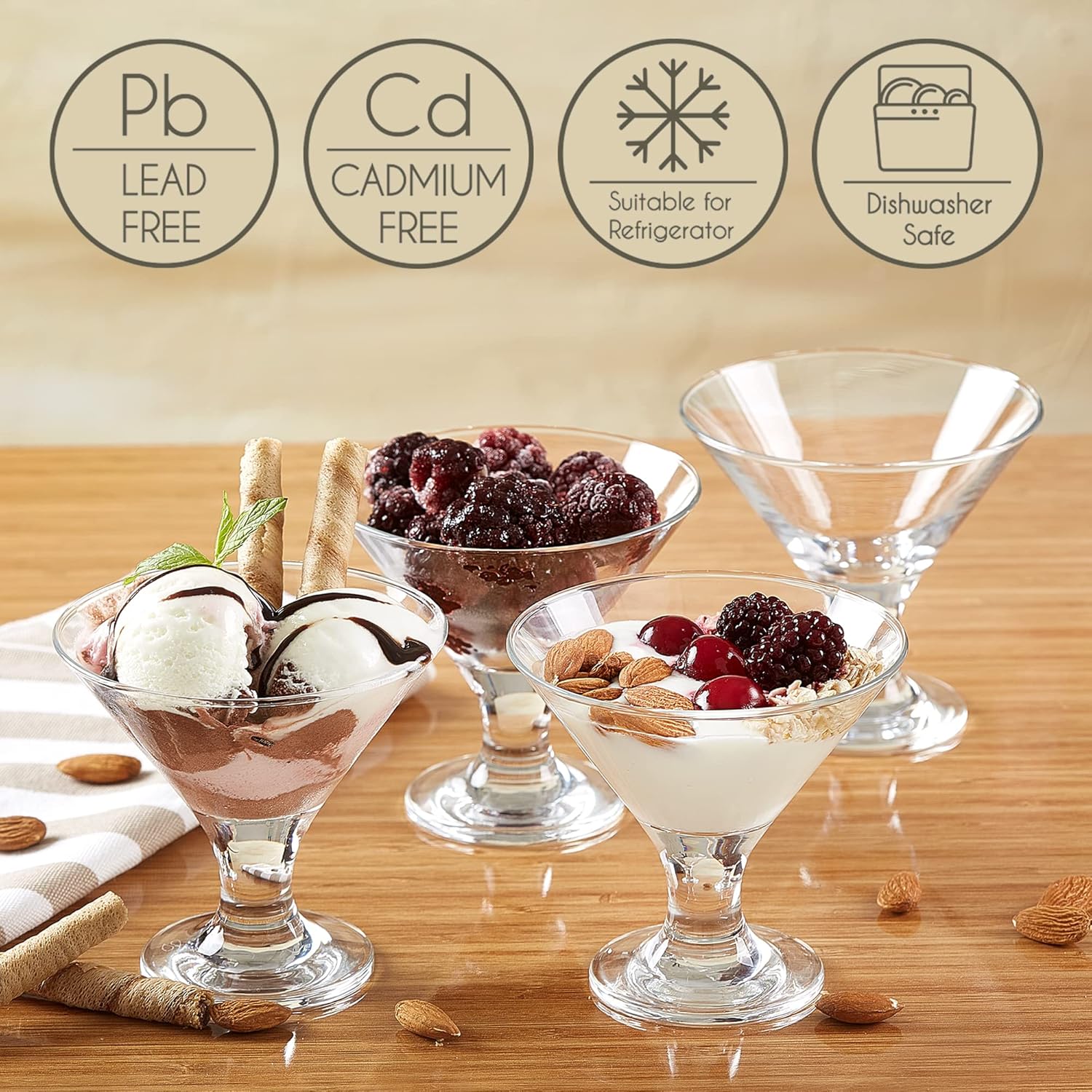 EXCEPTIONAL ICE CREAM BOWLS: Crystalia ice cream bowl set is made with high-quality toughened clear and smooth glass. These excellent serving coupes are perfect for ice cream, trifle, parfait, sundae, pudding, frozen yogurt, gelato, fruit, condiments, candy, jello, nuts, Turkish delights, and even sweet compote. LEAD-FREE & CLEAR GLASSWARE: Dessert bowl set which can be used also small trifle bowl does not contain harmful elements such as lead and safe for eating and drinking. Lead-free glass is not only safe for food contact but refracts more light than ordinary glasses, so you can see your food more clearly. MULTIPURPOSE FOOTED DESSERT CUPS: The footed mini triffle bowls are a perfect addition to your kitchen collection at home or your shop. Comfortable in the hand; wide foot provides easy handling. Ideal to present your desserts. It is dishwasher and refrigerator safe. Capacity 6.25 OZ (185 cc). Perfect size to enjoy your ice cream! ELEGANT DESIGNED ICE CREAM SUNDAE GLASSES: This individual tasting dish, with its truffle-like shape, is an excellent gift for any occasion. It is also suitable for trifle or gelato. Ships in a beautifully designed printed box. The perfect gift for Christmas, Birthday, or Wedding Anniversary. Great for engagement parties, promotion parties, gatherings with friends, or formal dinners.