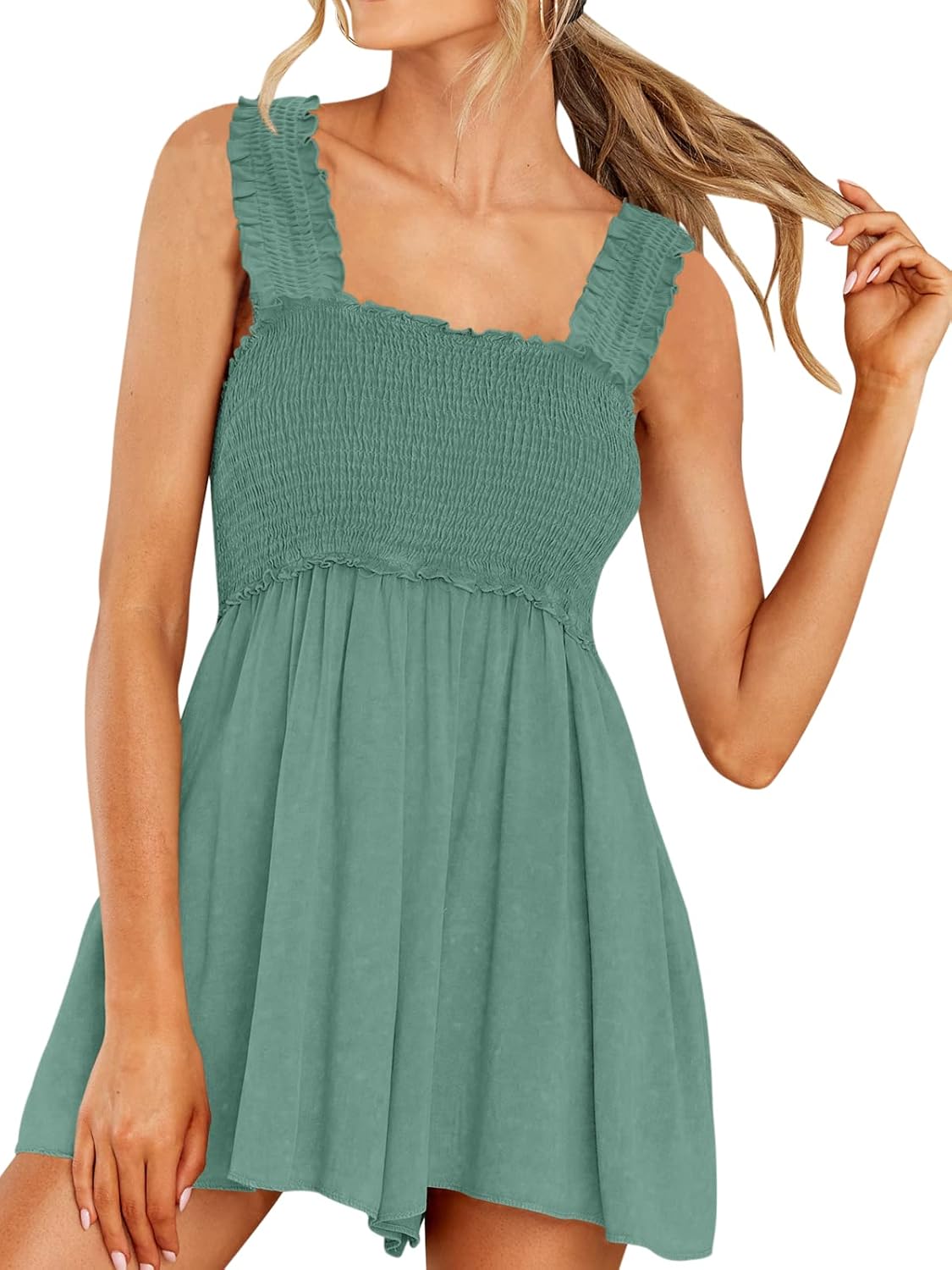 DEEP SELF Women Summer Sleeveless Romper Square Collar Ruffle Straps Flowy Short Jumpsuit with Pockets Medium 4-grey-green