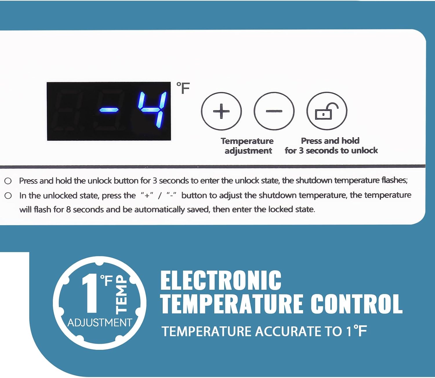 ????[Compact Size but Big Convenience] DEMULLER 3.5 cubic feet free standing chest freezer is the perfect size for smaller living spaces, such as apartments, dorm rooms, or RVs. Its compact design makes it easy to fit in any room, while still providing ample storage space for your frozen goods. ????[Customize Your Temperature Setting] Easily adaptable with electronic control, intelligent digital display that can achieve precise temperature control to 1°F. It allows you to set the internal temperature of the freezer. Temperatures range from -15°F and 41°F, so you can find the perfect temperature for your meat, seafood and ice cream. ????[Cooling System for Optimal Performance] Equipped with R600a compressor, this chest freezer features D-shaped cooling tubes that surround the inner cabinet, providing superior cooling performance and efficiency compared to traditional freezers. Want quickly cool drinks and fresh food, DEMULLER chest freezer is your optimal choice. ????[Whisper Quiet Operation] Our chest freezer is designed with a high-efficiency R600a compressor that runs at a lower noise level than traditional freezers, making it perfect for shared living spaces or quiet environments. With a noise level of less than 38db, you won't even notice it's there!