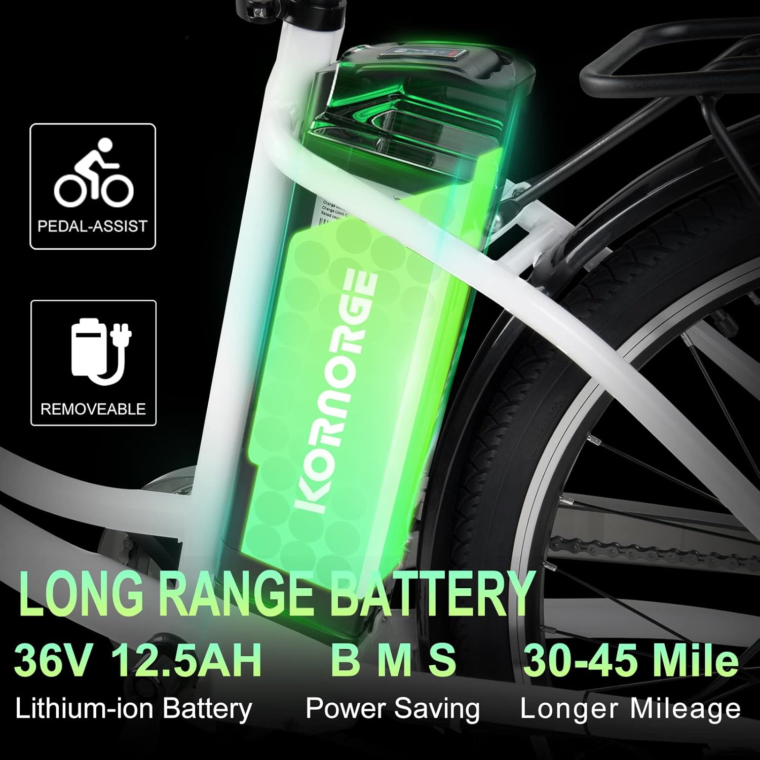 KORNORGE Electric Bike for Adults - 26" Commuter Electric Bikes, Cruise ebikes with Removable Battery, Shimano 6 Speed and Dual Shock Absorber, City Electric Bicycle.White