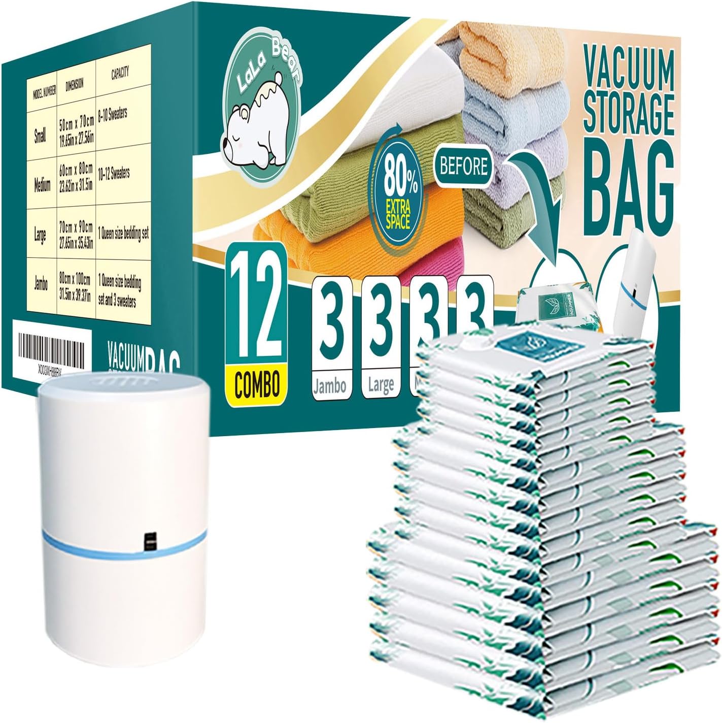 LaLaBear Vacuum Storage Bags,12 Pack (3 Jumbo/3 Large/3 Medium/3 Small) Space Saver Bags, Vacuum Storage Bags with Electric Pump, Comforters, Blankets, Bedding