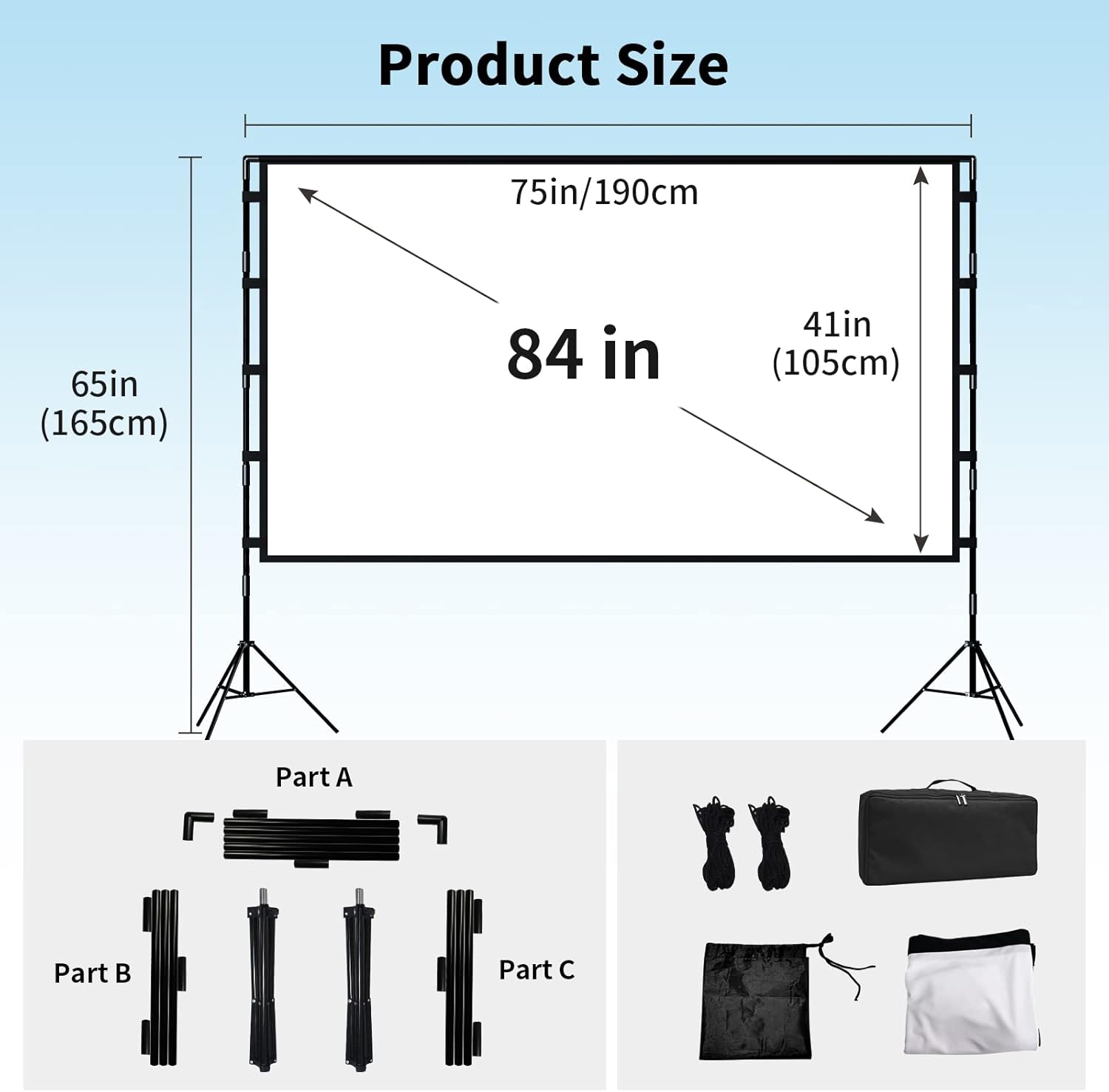 Lightweight and Detachable tripod:Projector screen stand is very durable, making it not easy to bend, deform, and break. The stand is not only beautiful but also lightweight. The projection screen pairing with grounding spikes,ropes anda sandbag make it to sturdy enough to be used in outdoor. Wrinkle-Free Movie Screen: 84 inch projector screen, 16:9 format,160° Wide Viewing Angle. screen for projector is made of polyester milk silk, thicker than other ordinary screens. The movie projector screen is foldable, washable and soft, so it is very portable and easy to clean from stains.Thick and Wrinkle-Free design giving you more fun, even support FRONT and REAR projection. Easy to Assemble and Disassemble: outdoor projector screen comes with an instruction manual to quickly set up and get started in just a few steps. Very quick and easy. Detachable crossbar can be assembled easily with no tools required, and the tripod can be opened quickly. Great for rapidly transferring places with less time. Easy to Carry: Portable projector screen can be packed in the included carry bag, easily transported, and is well protected.You only need one hand to lift the 7.4 pounds screen for projector and carry it anywhere you want to go to start your movie journey.Its portability allows it to be widely used for various activities outdoors or indoors, perfect for home, camping, school, office, wedding, church, etc.