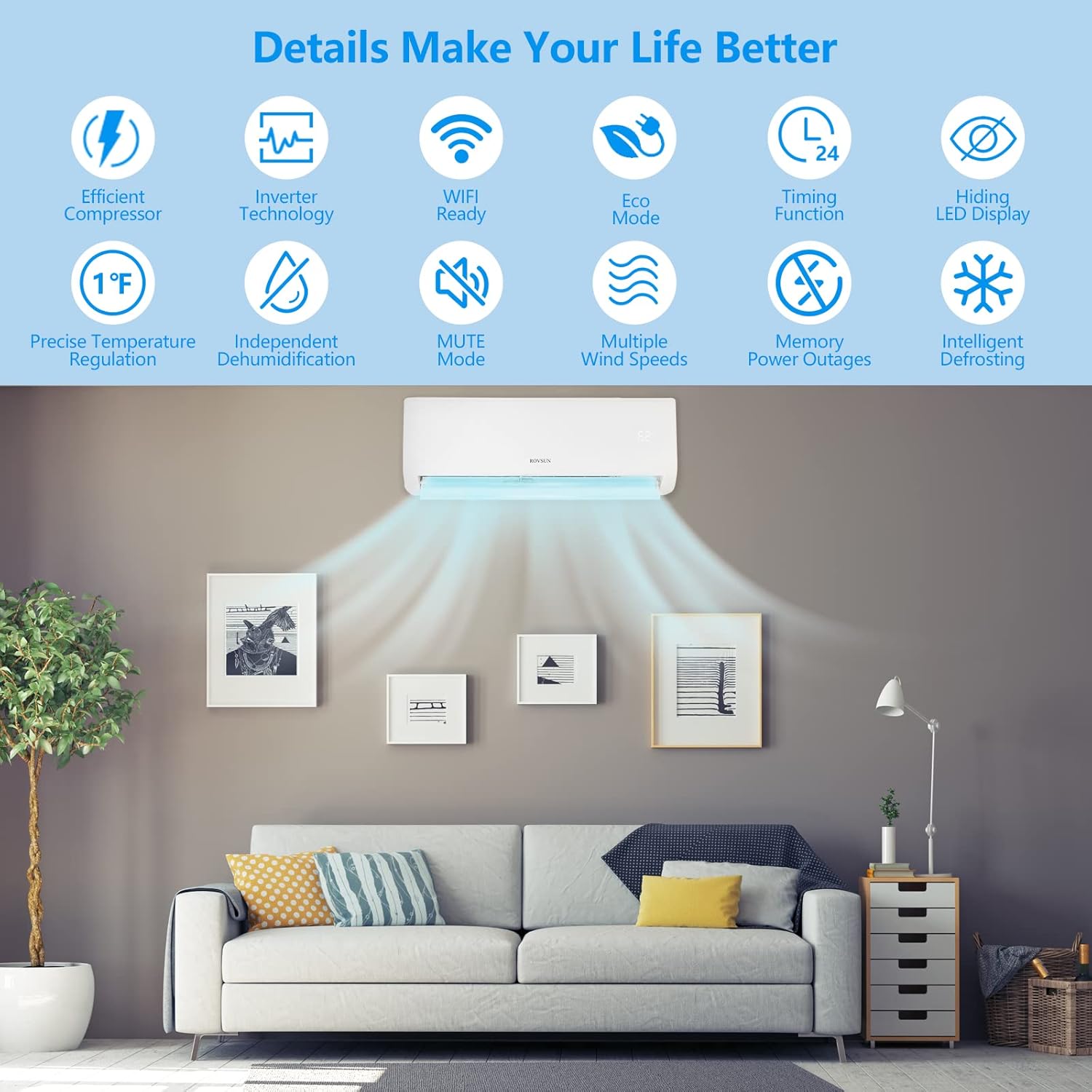 EFFICIENT AC UNIT(INVERTER) - 9000 BTU,115V, 19 SEER, Pre-Charged up to 25 Feet High Efficient Ductless Mini Split Inverter Plus System with Heat Pump and Dehumidification, AHRI Certified AUTOMATIC SYSTEM - Auto Defrost, 24 hour timer, Sleep Mode, Eco Energy Saving Mode, Multiple Fan Speed, and Intelligent Compressor Pre-Heating. Power Off Memory Function SMART COMFORT - The unit can easily be controlled and adjusted from the remote control or from the app; also it will sense room temperature then adjusts airflow & temperature accordingly for the ultimate in personal comfort control & energy savings QUIET COOLER & HEATER - Ultra Silent at only 26-41 (dBa) and beautifully built. Unit provides equal airflow in every part of your room and can set the room temperature varying from 61℉ to 88℉ to suit your comforts in just a few minutes