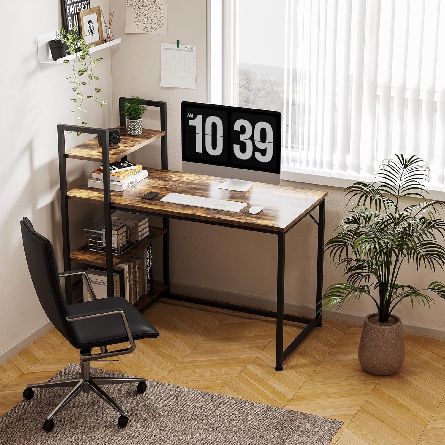 【LARGE ORGANIZED SPACE】Large desktop provides enough space to place laptops, computers, keyboards, and daily necessities,3 tiers of under-desk open shelves add extra space for storing books, files, and more. 【STURDY & STABLE】This modern desk is made of a thicker metal frame and sturdy wood for stability and durability, and the additional metal fixing bar makes the whole desk's weight capacity up to 300 lbs. 【3-Tier STORAGE SHELVES】The three-tier open storage bookshelf helps you organize your items and decorations more effectively, keeps your desktop organized and tidy, and brings you a more comfortable experience. 【MULTIPLE USEAGE】Our desks can be used as writing desks, study desks, or as work desks. The adjustable feet under the desk not only help protect your floor from scratches but also ensure stability even on uneven ground.