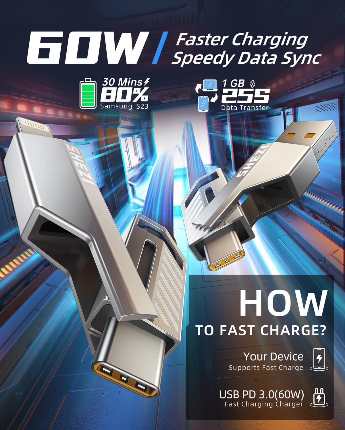 ????️[Lifetime Warranty] To show our confidence in the quality of our products, we offer you a lifetime warranty. ????[4-in-1] These multi charging cables were designed with the idea of simplifying your life. They combine four ports - USB A to C, USB A to Micro/Lightning, USB C to Micro/Lightning, and USB C to USB C - in one cable. No need to carry multiple cables for different devices and you are allowed perfect charging even with a thick phone case. ????[60W Fast Charging & Data Transfer] This charger cord provides up to 60W Output. The phone can be charged up to 65% in less than 30 ~minutes. In addition, SHEZI charging cable also supports data transfer, 1G file transfer takes only 20 seconds. Save more than two hours of charging time per day. ????[Retractable & Portable & Tidy] SHEZI USB C Cable offers 5 adjustable Lengths: 20cm-50cm-70cm-90cm-110cm. Support both ends or one end pull, you just pull both sides to retract easily and completely hidden in an aluminum alloy tidy organizer. Easy to place in your handbag, laptop bag, or pocket. Cut down on clutter and save some space.