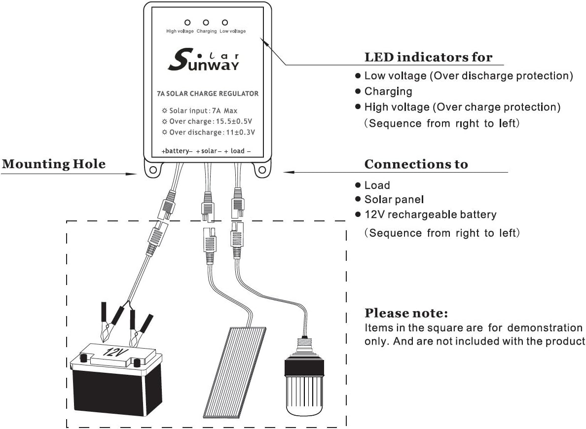 [For 12V DC Solar Systems]--This 7A solar battery charge Regulator use only for 12 volt DC solar power systems, solar panels and 12 volt rechargeable batteries protection. {IMPORTANT: Always Connect The Battery First and Disconnect Last.} If you need a 12V DC Quick Connect 16FT Extension Cable, please check the ASIN: B06X6LJTD6 . [Solar Power Input 100W Max.]--Max. input Voltage:22Volt DC, Max. Current:7 AMP, solar Panel 100 Watt Maximum. Power Output: 12 VDC Battery. It can work with 5w 10w 20w 30w 50w 60 watts 100watt solar panel. [LED Indicators For Easy Monitoring]--This solar battery controller integrated with 3 LED indicators(green.yellow,and red) for low voltage(over discharge protection),charging and high voltage(over charge protection). [Quick and Easy Connection]--This solar battery charger controller coming with Versatile quick connect and quick disconnect clips SAE Plug Cable, quick and easy connection to solar panel,battery and load appliance. Users don’t worry about the Positive(+) and Negative(-). Get a 'sae polarity reverse adapter' if your polarity is reversed,please check the asin B07GPGPTFV.