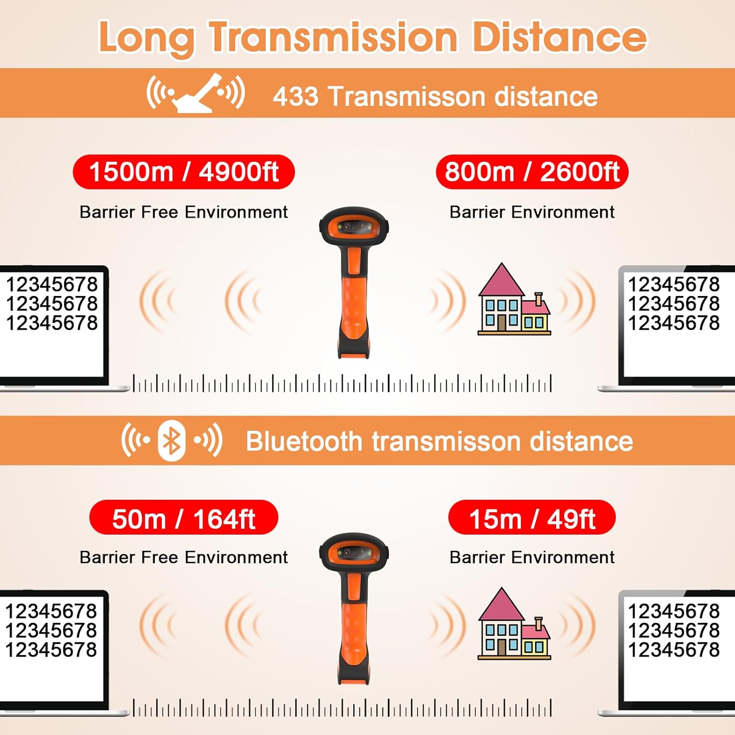 [2.4G Wireless & Bluetooth 4.1 & USB2.0 Wired Barcode Scanner]: ⏩ 3-in-1 operation modes ,you can switching more conveniently.When a scan is successful, you receive a tactile signal in the form of a mild vibration. Buzzer can be set to mute to allow for a quiet operation. [Long Transmission Distance]:⏩Delivers up to 200m transmission in open air under the 2.4G wireless mode, Up to 30m transmission in open air under the Bluetooth mode.Note:The base cannot be charged, and the USB cable must be plugged into the scanner to charge. [Industrial Dustproof and Waterproof]:⏩Dust-proof, Splash-proof and Waterproof performance have reached IP67 level, It can be rinsed with tap water and even soaked in water for up to 30 minutes. External TPU protective case is 2 times as thick as similar products. Triple consolidation treatment is made for internal core parts. Withstands repeated 6ft. (1.8m) drops to concrete floor. [High Compatibility]:⏩Supports connection with smart phones, tablets, PC based on windows XP/7.0/8.0/Win 10, Windows Mobile, Android OS, iPhone/iPad etc.