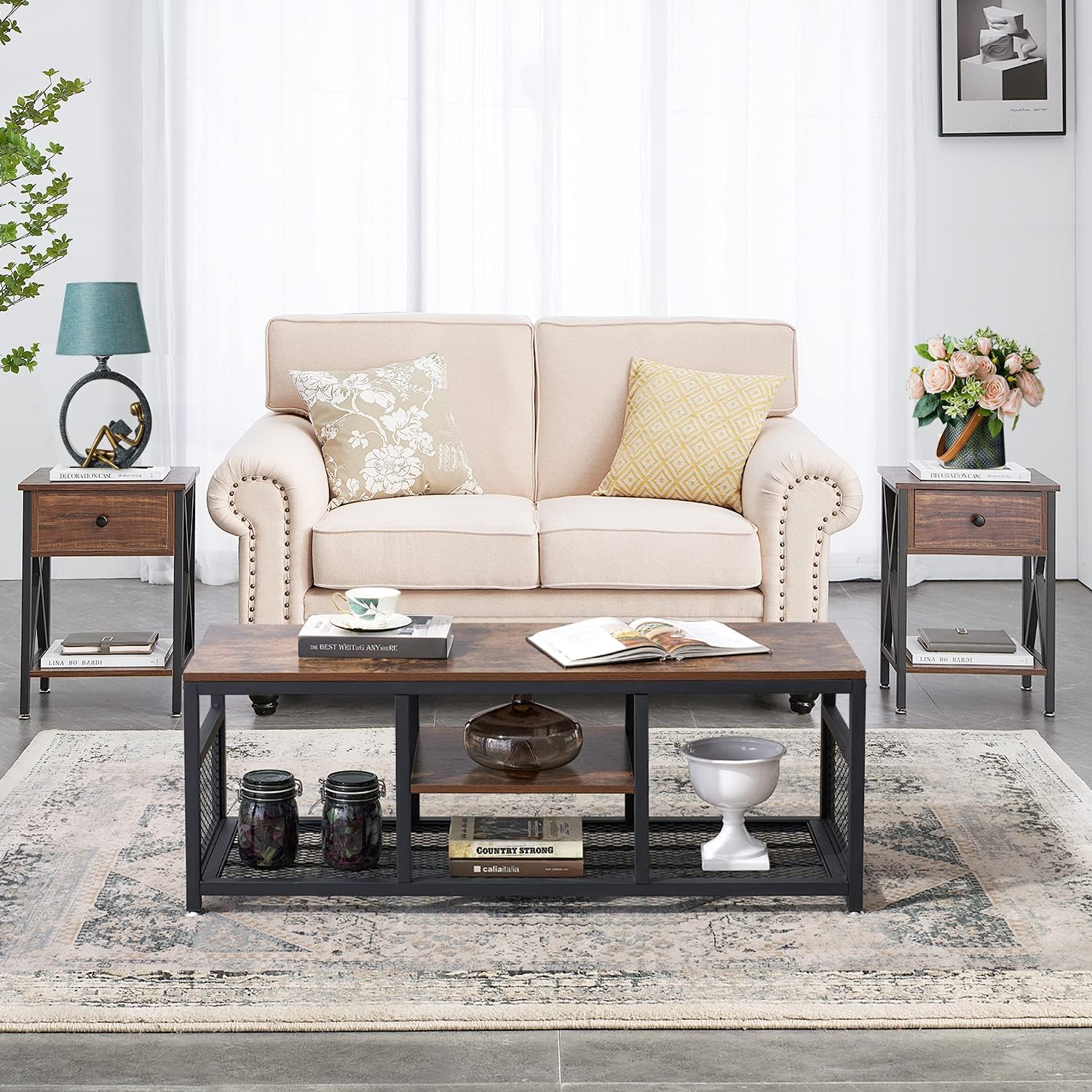 【Fit For Any Room】Modern coffee table with trendy mesh and rustic engineered wood make your room charm and impressive. It can fit well with any furniture styles in any living room,home and office. Not only as a furniture, but also as a home decoration. 【3-Tier Storage Space】VECELO coffee table features 3 tier storage shelves, provides spacious space to store remote controls, snacks, trays, books and magazines.Space saving and makes your items within reach. 【Versatile Living Room Tables】 Suitable for many occasions, such as a bedroom, living room, study, office, pantry, etc. This vintage coffee table can be used as a tea table, tv stand, or even as a space-saving desk. An easy-matching style will go well with any other furniture. 【Sturdy & Stable Side Table】Crafted of Eco-friendly particle board, which is high temperature resistant and waterproof. The solid black metal frame ensures stability and durability.Easy to clean with a wet cloth. (Surface up to 130 lb, bottom mesh shelf up to 44 lb)