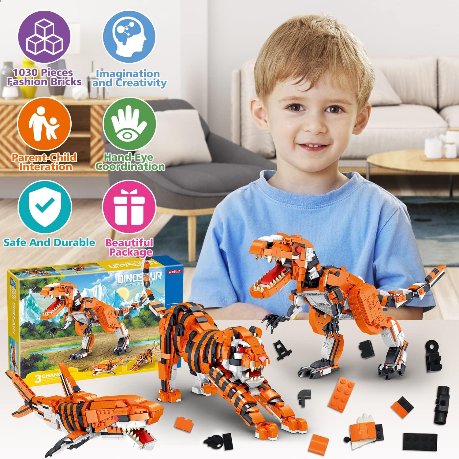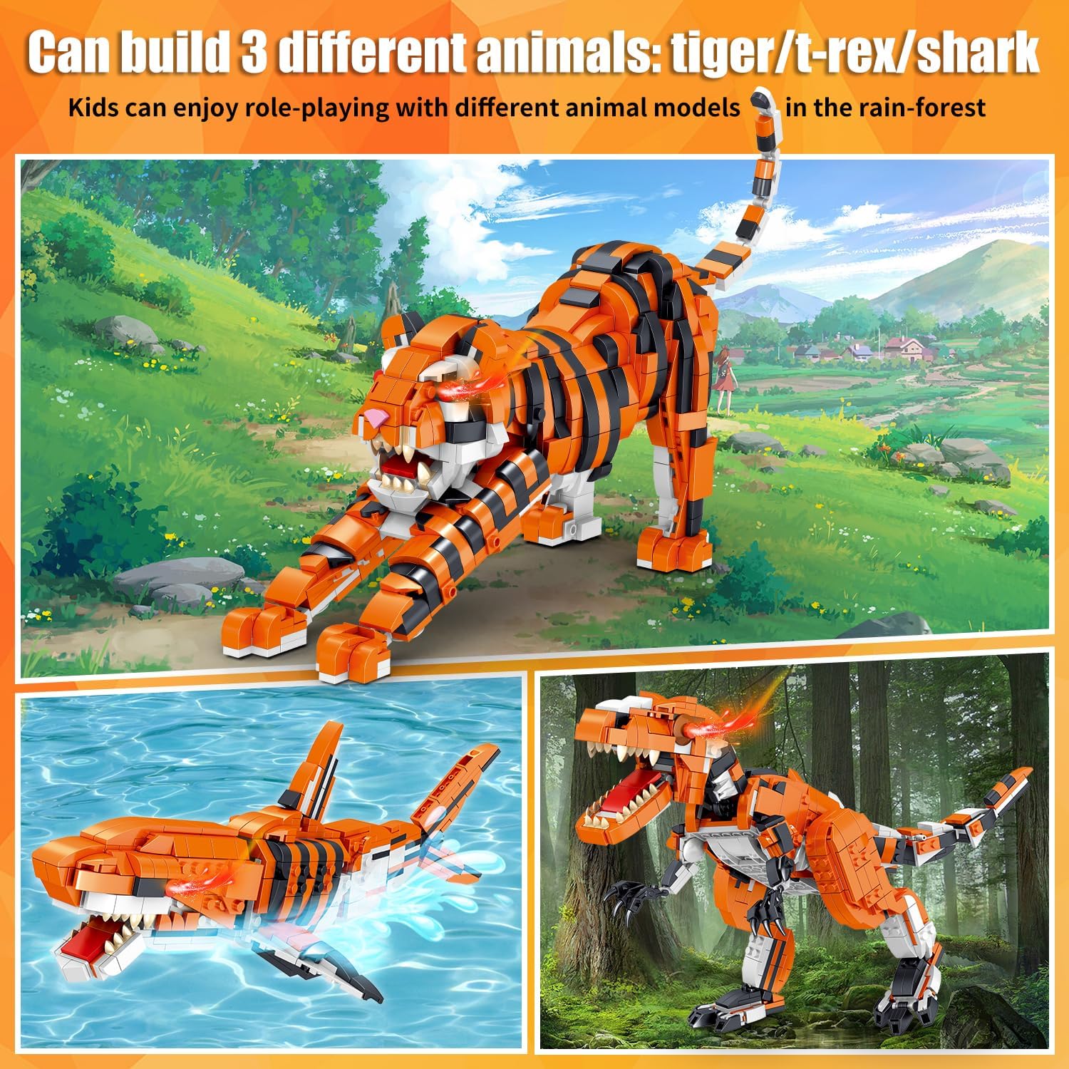 WINGIFT 1030 Piece STEM Building Blocks Toys-3in1 Mini Transforming Toy Building Set with Dinosaur/Tiger/Shark Building Kit, Educational Toy for Kids 6-12, Best for Boys and Girls Ages 6 7 8+ Tiger Building Set