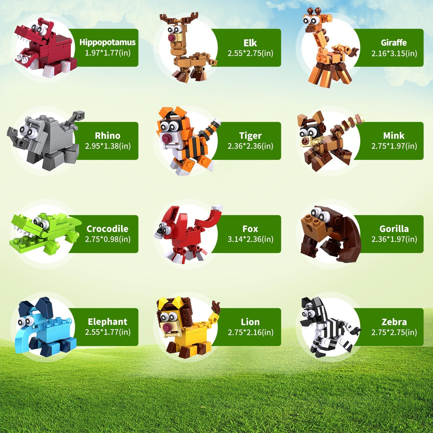 【Cute animal shape design】The 12 animals are fox, Giraffe, Tiger, Gorilla, Zebra, Crocodile, Elk, Rhino, Hippopotamus, Mink, Elephant, Lion, lion, Sheep, Hippo, Rhino, Dog, Rooster, Squirrel, Penguin, Parrot, Crocodile,Turtle, Elephant. The Kids can easier to learn & recognize the shape and structure of animals by building them, lmproves children's interest in building and color recognition ability 【100% Safety Material for Kids】This mini animals building blocks set are made of high-quality ABS. Smooth edges without burrs, All toys component used child-friendly materials Non-Toxic and Lead/BPA/Phthalate Free. We conduct rigorous lab tests to sure the animals building toy are 100% safe 【Puzzle Early Education Toys】The 24 animal blocks stimulate children's brains to think during the building process, which can improve children's hand-eye coordination, imagination and creativity, and help children exercise motor skills, Logical thinking and problem-solving skills 【New Superior Gift for Your kids】This Mini Building Blocks Toys for small hands to hold, Easy to assemble and disassemble, Which can stimulate your child's imagination and logical thinking ability. When you bring a mini animals building blocks sets to accompany your kids to parties, Birthdays, Easter, Thanksgiving, Halloween, Christmas and other occasions, It would be a nice holiday gift