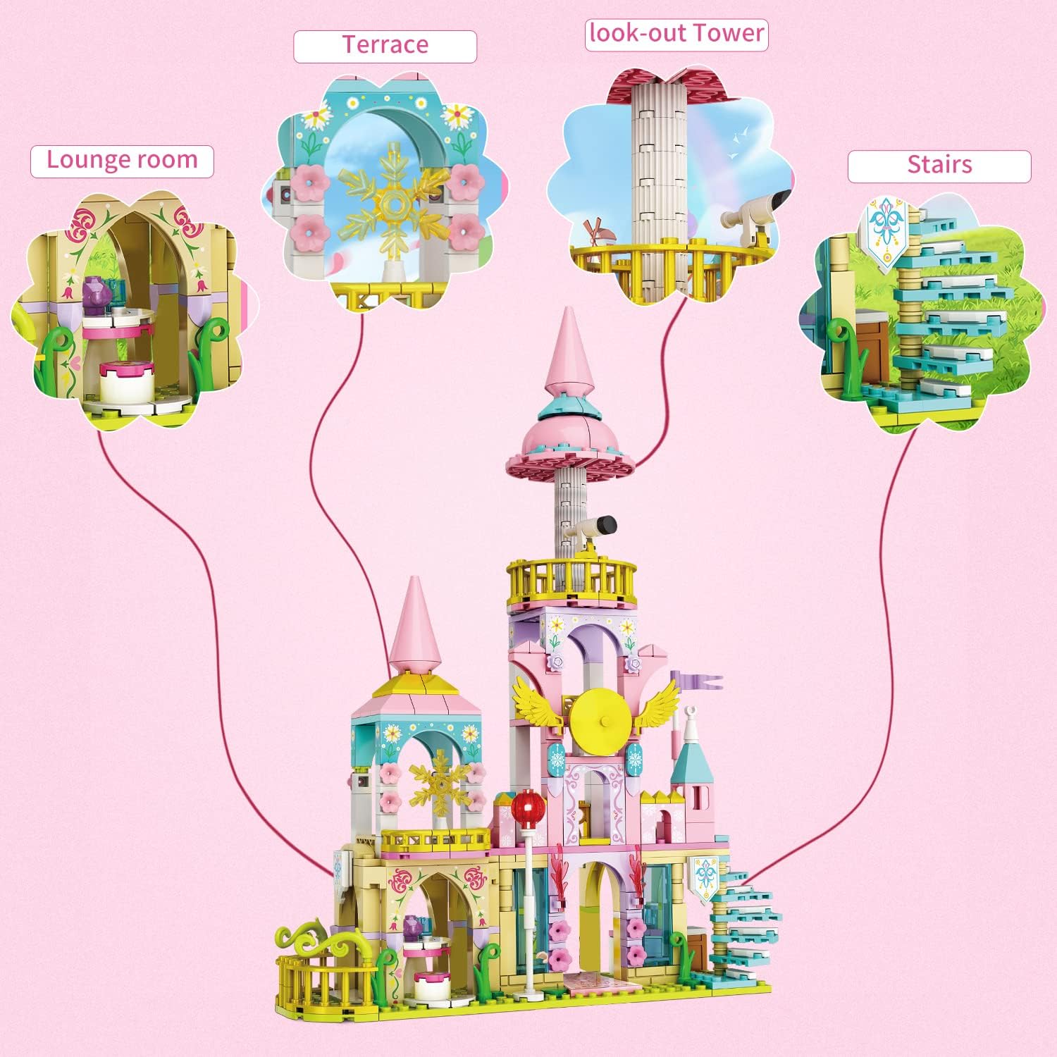 【Girls Fantasy Dream House Set】Every girl has a princess dream, this exquisite pink castle series will become a girl's dream house, dance and play games with cute girls, let her be your unique little princess, tell her princess castle story when building blocks, it will be an unforgettable parent-child time 【Girls Castle Princess Building Toys】This girls building block toy can build a 3-story castle, Including lounge, spiral staircase, balcony, central tower and look-out Tower and many other realistic details. Kids can enjoy a grand court ball with friends, role-playing as princes and princesses dance in the ornate gazebo. Build different styles of castles, Which can use imagination and creativity to develop children's hand-eye coordination, Patience and problem-solving skills 【Learning By Playing】This creative castle building kit for kids includes a full-color instruction booklet showing easy-to-follow and follow steps, and for convenience, the building pieces are placed in individual bags in numbered order. Building STEM building toys that help develop your child's teamwork, logical thinking and problem solving. This fun, action-packed building toy is perfect for solo or group play 【100% Safety Material for Kids】This castle building kit are made of high-quality ABS. Smooth edges without burrs, All toys component used child-friendly materials Non-Toxic and Lead/BPA/Phthalate Free. We conduct rigorous lab tests to sure the castle toy are 100% safe