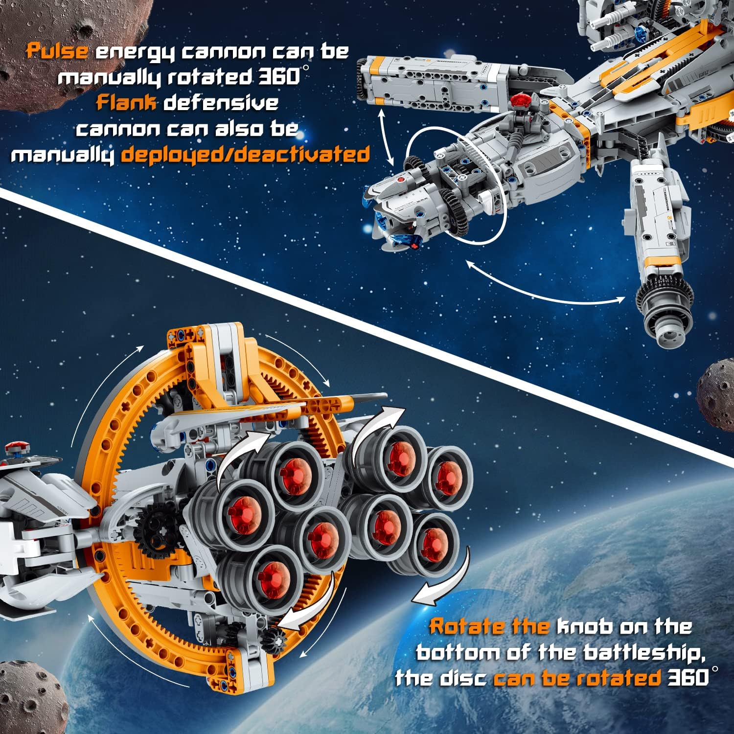 【Creative Building Set】This spacecraft construction playset with 955 pieces and is compatible with other well-known brands space tech pieces collection sets,Perfect for space movie fans and building block lovers alike. The package comes with an illustrated guide, part sizes and angles are printed in a 1:1 scale for quick reference. STEM building toys kit for kids and adults ages 6-14+ to Keep them occupied for hours 【Cool And Relistic Design】This space battleship suit has many details, Rotate the knob at the bottom of the battleship, and the disc can rotate 360°. with a large propeller mounted on the tail, which is simulated to generate enormous force to propel the spacecraft over long distances, and it is equipped with a cannonball tubes and adjustable turrets. Let you experience exciting role-playing, just like being in a space war 【Learning By Playing】This starship building set includes a full-color instruction booklet showing easy-to-follow and follow steps, and for convenience, the building pieces are placed in individual bags in numbered order. Building STEM building toys that help develop your child's Imagination, creativity, hand-eye coordination, teamwork, logical thinking and problem solving. This fun, action-packed building toy is perfect for solo or group play 【100% Safety Material for Kids】This space warship toy building kit are made of high-quality ABS. Smooth edges without burrs, All toys component used child-friendly materials Non-Toxic and Lead/BPA/Phthalate Free. We conduct rigorous lab tests to sure the spaceships construction playset are 100% safe
