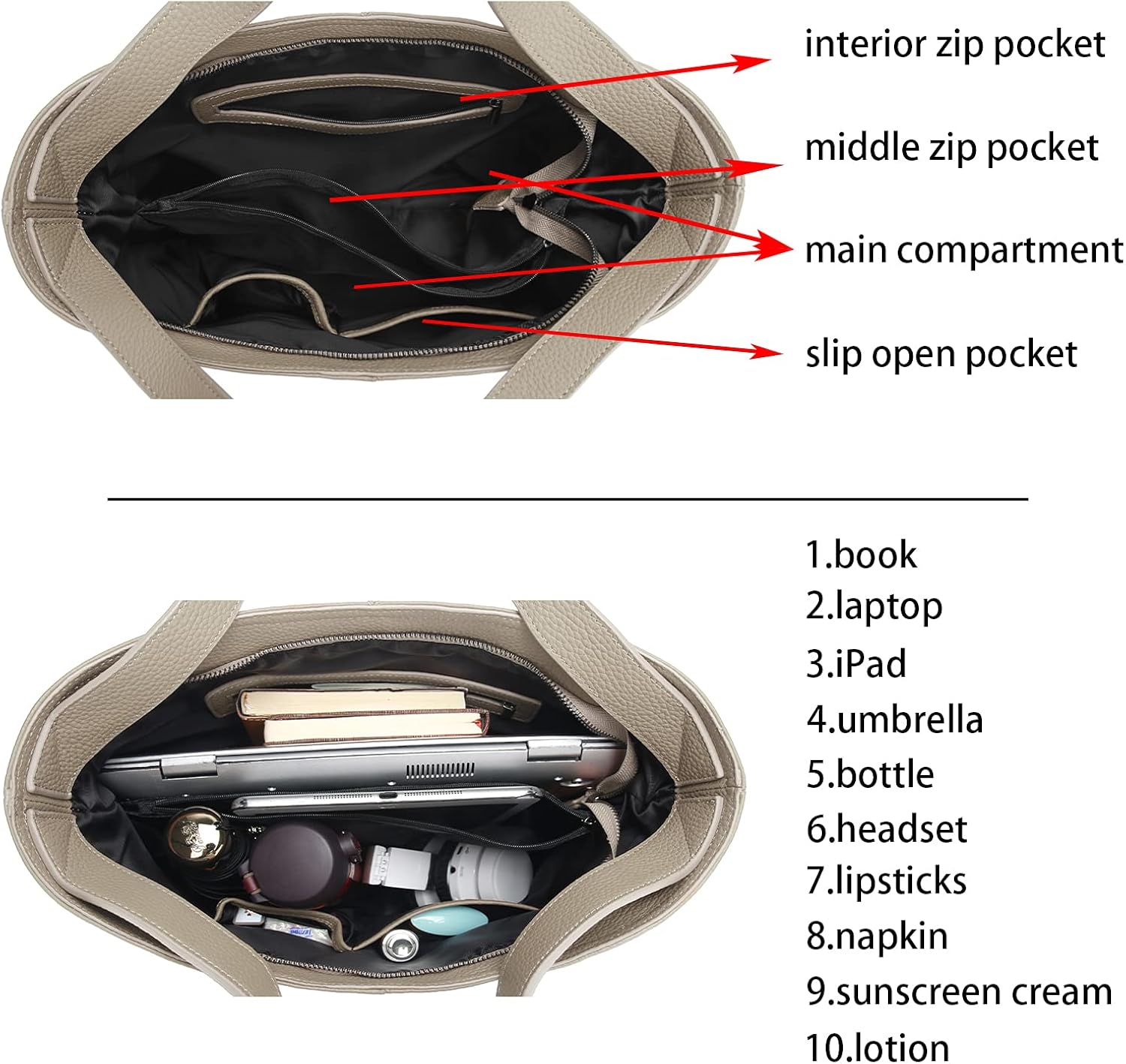 Leather Genuine Leather with gold color Hardware. The high quality polished gold tone hardware and Top zipper closure; Extremely nice look with durable and soft fabric lining Structure: Interior: 2 main compartments fit for your 13 inches laptop and books, 1 middle zip pocket for Ipad, 2 slip open pockets for umbrella and bottle, 1 zip pocket for your cell phone or keys. Outside 1 back zip pocket. Perfect for dating, shopping, working, traveling, vocation, everyday use etc. Nice Gift for families, wife, friends, parents on any significant moments: anniversary, birthday, holidays, Celebration Day.
