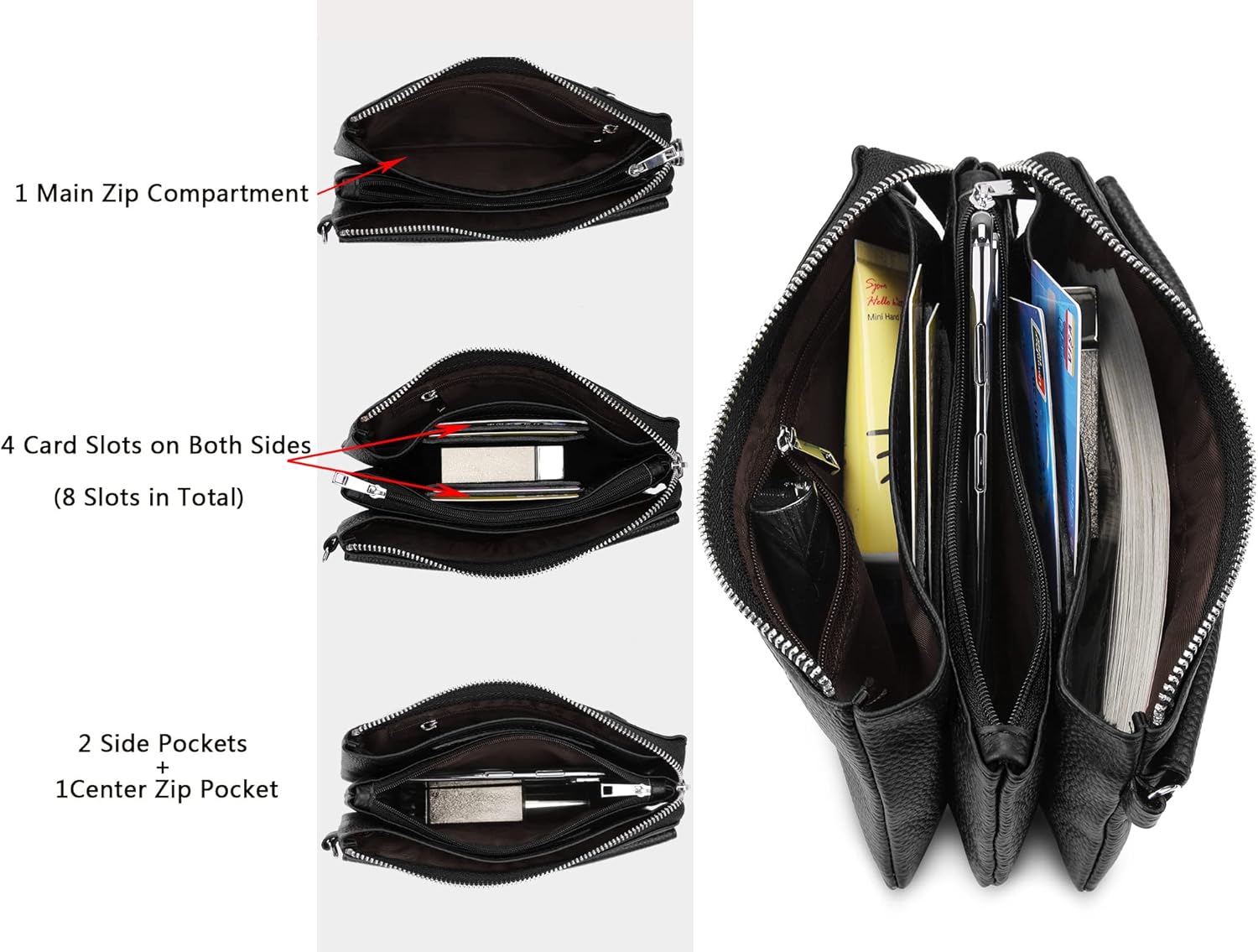 A clutch size purse made from Soft Leather. 3 compartments with a wrist strap and a shoulder strap for multipurpose carry. Shiny silver-color hardware, heavy duty zipper and detailed contrast stitching brightens up the wallet. 3 compartments and 8 card slots that are RFID PROTECTED. Has an front snap pocket for IPhone 6 Plus,Samsung Galaxy S3/S4/S5/S6 and LG G3/G4 ,Samsung Note 2/3/4/5. Triple compartments is designed for you to keep your cash, cards ,makeups,and smartphone oraganized well and easy to use.