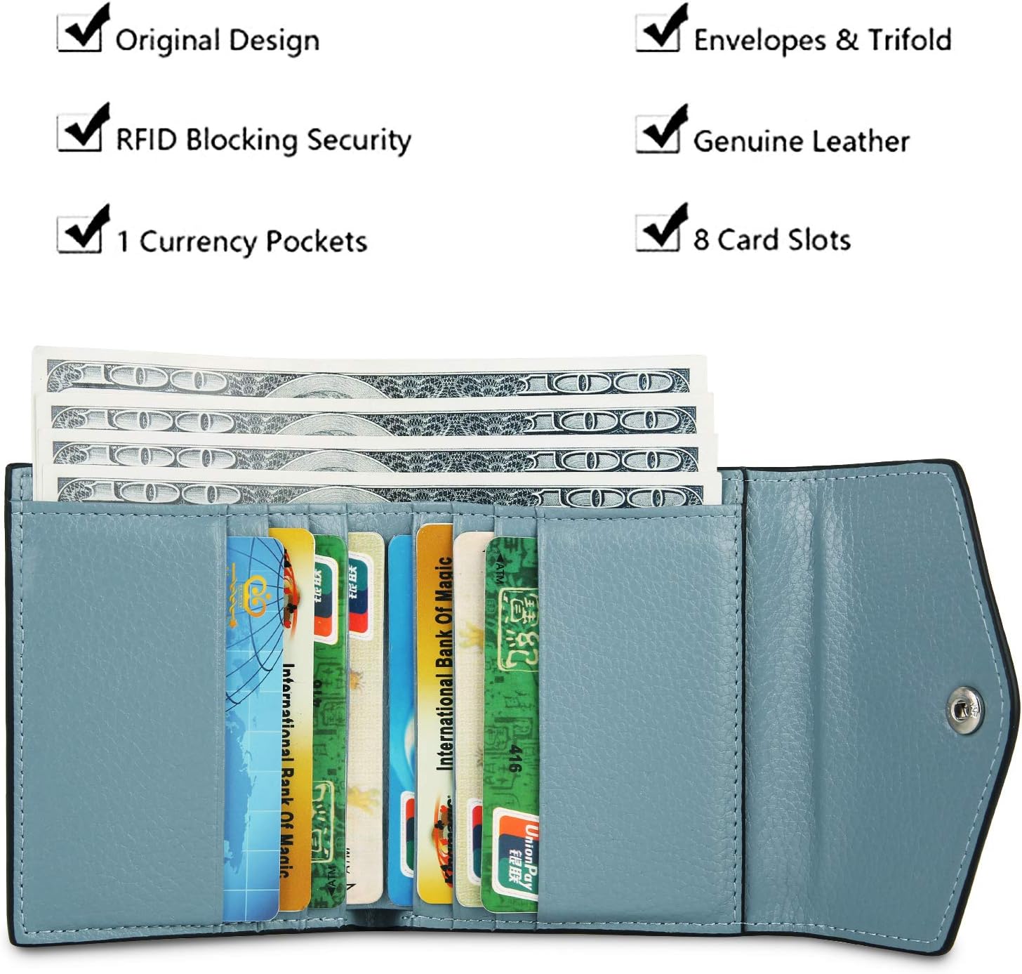 ➤Material: Made from high quality soft genuine leather,durable and stylish ➤Capacity: 8 card holder and 1 additional slot,1 full-length bill or cash section. It stays closed and flat when stuffed. ➤Perfect for Ladies who doesn't like to carry a big wallet around town.Clear layout and bifold design is made for you easy access to cash and credit cards.Comes in a Environmentally friendly packaging and ready to be gift for someone who likes compact small wallets.