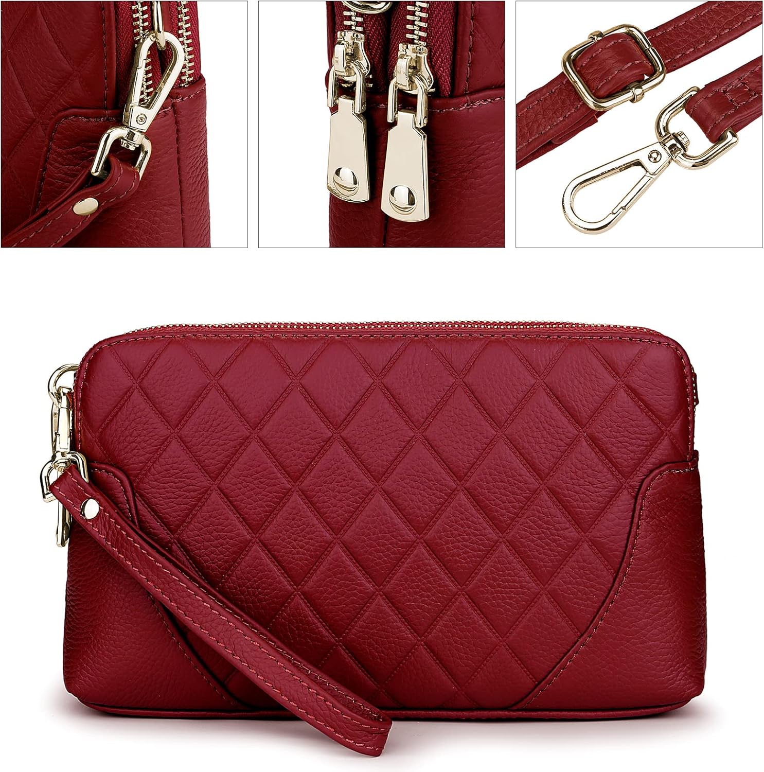 YALUXE Womens Wristlet Real Leather Quilted double zippers Large Clutch Wallet Shoulder Strap X-red
