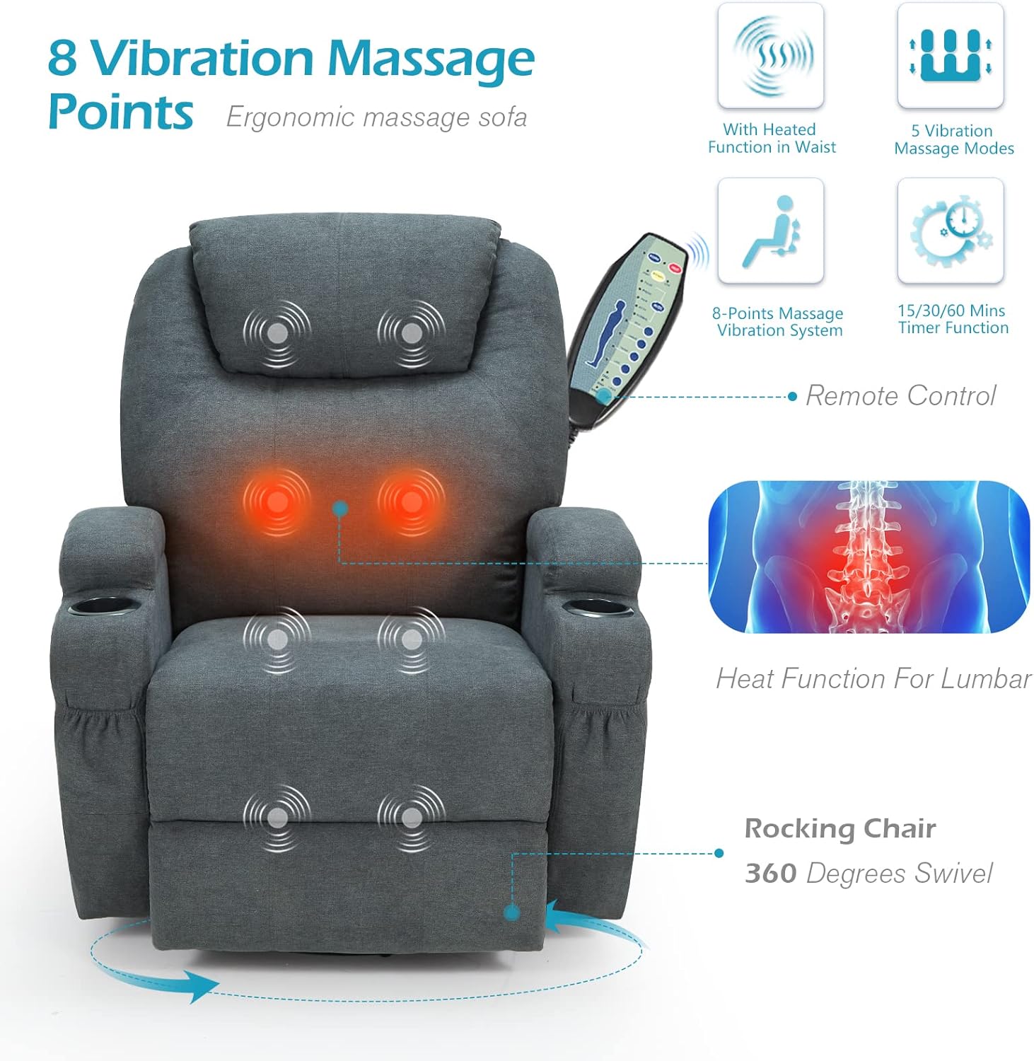 【MODERN DESIGN】 : This lazy boy reliner chair with soft fabric material gives a sense of comfort and is suitable for your living room, bedroom or office. The recliner is designed with ergonomic tilt angle of up to 140°. You will have a comfortable seating experience while relaxing on the chair. 【360° SWIVEL & ROCKING】 : YODOLLA recliner sofa with a rocking function has a high backrest and thick cushion that are designed for comfort. It can be rotated 360° so that you can turn to any direction without leaving the chair.The chair has a maximum load capacity of up to 300 lbs. 【MANUAL CONTROL MASSAGE RECLINER】 : YODOLLA recliner swivel chair has 140° manual control recline featureis and it is designed with massage and heat function with the remote control. There are 8 vibration massage nodes for back, lumbar, thigh and legs with 2 vibration intensities and 5 massage modes. 【UPGRADE DESIGN】 : The massage chair with pockets on both sides provides ample space for storing your phone, ipad, books or other small items and is convenient within reach. 2 cups holders on both armrests also meet your need.