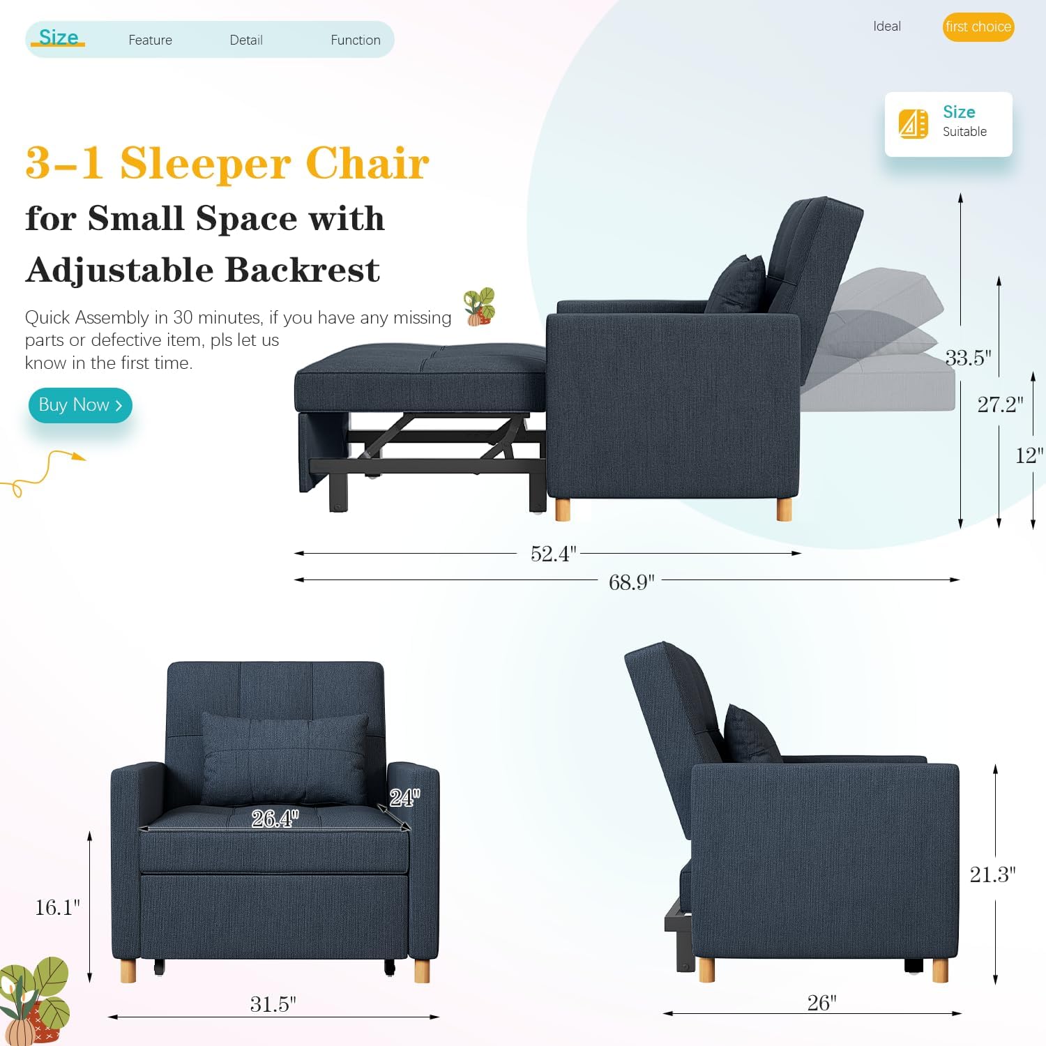YODOLLA Sleeper Chair, 3 in 1 Chair Bed for Adults, Pull Out Sofa Chair with Pillow and Convertible Backrest, Multi-Functional Fold Out Futon Chair Reading Chair for Small Space (Navy) Navy Blue