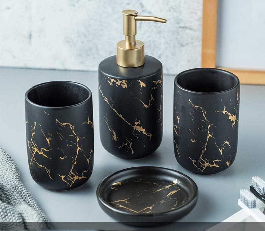 ❤❤High Quality Ceramic Material: Our bathroom accessories sets are made of high-quality ceramic. The surface is smooth and textured, durable. It is a good container for storing shower gel, hand sanitizer, soap and toothbrushes. In addition, it will not leave any marks on your countertop and is easy to clean. ❤❤Classic Marble Design: The bathroom accessory set is decorated with marble effect. Black and white are the most classic colors, while yellow and gray are the most fashionable and popular colors. With subtle golden stripes, it is very beautiful and fashionable. ❤❤Easy to Clean: Smooth ceramic material, smooth and easy to clean, no need to worry about the stubbornness of stains. It is safe and easy to clean for daily use, just rinse and wipe with a soft cloth. ❤❤Complete Bathroom Accessories Set: 4 pieces bathroom accessories set includes a soap/lotion dispenser, 2pcs bathroom tumbler, a soap dish. Perfect for storing your toiletries and keep your bathroom counter fully organized neatly.